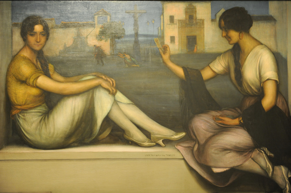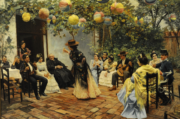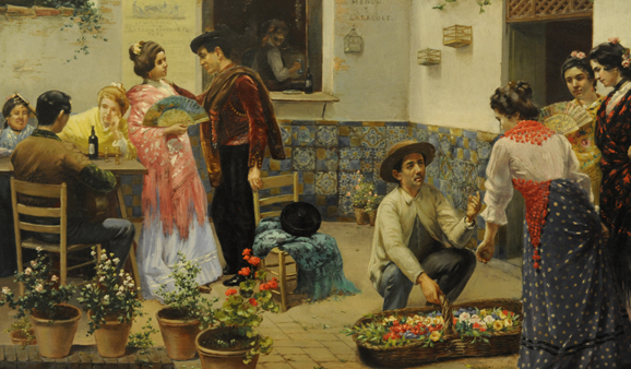Cejudo’s painting is really an exploration into the classic ideal of the Andalucian lifestyle. Set in a typical Andalucian patio, Andaluces en la venta shows women in their traditional dresses and with their mantónes (shawls) and abanicos (fans), the white houses with azulejos (tiles) on their walls, the flowers and the poster advertising a bullfight in Seville.