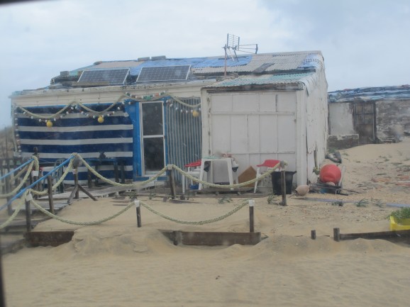 We took our tour with Doñana National Park Tours on a cloudy afternoon with a forecast for showers. The vehicles used are high 4x4 trucks, which can drive over mud, wet sand and anything else; their drivers are also official park guides, who explain all the various ecosystems and animals seen. The route takes you from El Acebuche, the main Doñana visitor centre, to Matalascañas, and then to the beach, where you drive along where the waves lap the shore - an experience in itself. The few fisherman's houses on the edge of the dunes near Matalascañas, with their boats next to them, use solar panels to produce electricity - these already existed when the park was created, so they were allowed to stay.