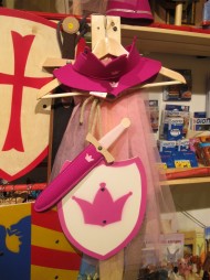 When I get my children a fancy dress outfit for Carnaval or Halloween, not being a dab hand with a needle and thread, like most of my mum friends I head for the nearest chino. So I was delighted to see a stall selling the most exquisite disfrazes, made of natural materials such as wood, wool felt, and silk. Not a jot of plastic or nylon in sight. They weren't Spanish, but they were well made and fab to look at. One look at the pink princess/lady knight outfit and my daughter was hooked. My son got a pirate hat and eye-patch (also made of wool felt).