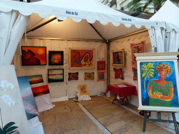 Alma de Sol shared a caseta (tent) with malagueña Carmen Aros. Carmen spent time living and studying in England, but now lives in Velez-Malaga, near Nerja. Carmen grew up in Patagonia, which definitely shows through in her work; the vivid colours scream out her Chilean roots. Carmen´s work is abstract, with fluorescent and multicoloured shapes, framed perfectly and beautifully by her husband Peter; the frame becomes an integral part of the artwork. This was Carmen´s first appearance at FIAM and she was very pleased to sell two paintings; although, like all great artists, she was also sad to part with them.