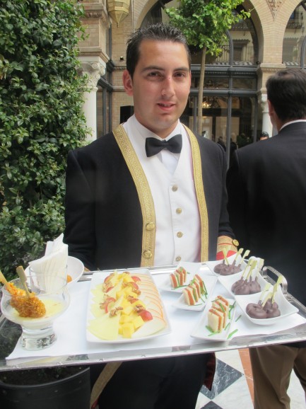 After the tour, we were treated to drinks and nibbles - extremely fine ones, as befitted the occasion. These were served by men and women in magnificent velvet "a la Federica" outfits, used for special occasions such as weddings, for which the Alfonso XIII is a very popular venue. I particularly liked the prawns in crispy parmesan crumb (left of pic, on tray), and the salmon caviar on a little china spoon.