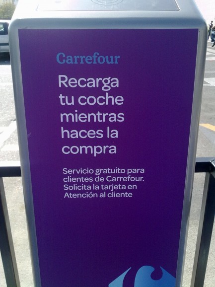 Iberdrola has signed an agreement with the Junta de Andalucia to provide 13 electric cars, and has also provided charging points. And the REE (Red Electrica de EspaƱa) also has one point in Seville. Carrefour offers charging points, offering free charges for customers, in plum parking spots right by the entrance.