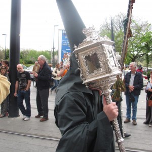 The nazarenos wore various styles of tunics and hoods, and carried different religious items, while the band, also called El Sol, plays for a number of other processions, but wore a personalised armband showing their current allegiance to this Christ, Varon de Dolores.