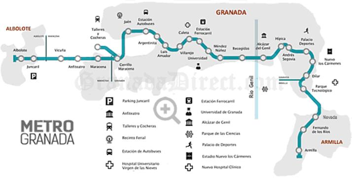 The Granada 16km-line crosses Granada from north to south and also connects the towns of Albolote and Maracena (north-east), and Armilla (south-east). The line serves 26 stations in total, of which just three - Méndez Núñez, Recogidas, and Alcázar del Genil - are located underground in central Granada, close to the river Genil.