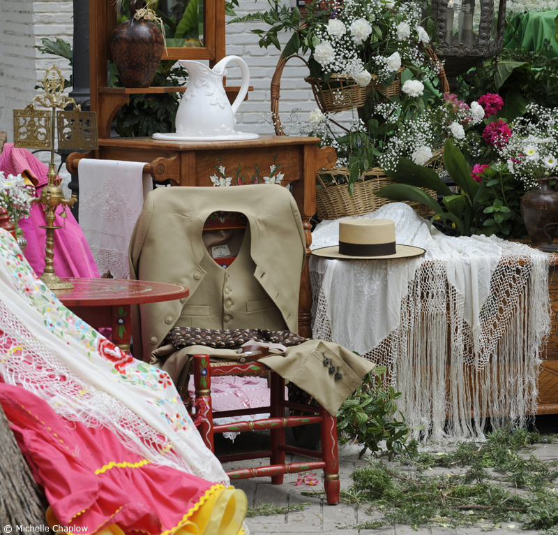 All kinds of traditional garments and objects - shawls. instruments, furniture and fruits - are brought by the neighbours to embellish the scene. In Estepona the festival is less traditional - some of the crosses have a more contemporary feel and are more experimental in the additional objects placed around the cross.