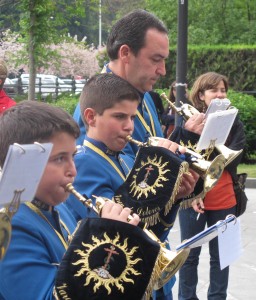 The nazarenos wore various styles of tunics and hoods, and carried different religious items, while the band, also called El Sol, plays for a number of other processions, but wore a personalised armband showing their current allegiance to this Christ, Varon de Dolores.