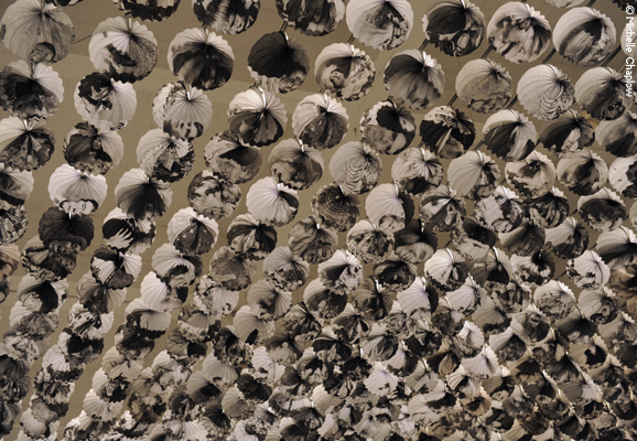 The exhibition is a light installation in the form of 2,500 traditional Spanish farolillas (small lanterns used at ferias) strung across the full breadth of the gallery. The rest of the room is deliberately left empty: the walls are white and completely bare. The lanterns are printed with images taken from archived issues of ABC newspaper, featuring both national and international news, printed in black and white.