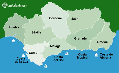 L'Andalousie est une région d'Espagne qui se compose de huit provinces s'étendant du sud-est jusqu'au sud-ouest du pays, chacune d'entre elles portant le nom de sa capitale de province : Cadix, Cordoue, Jaén, Huelva, Almería, Málaga, Grenade et Séville.